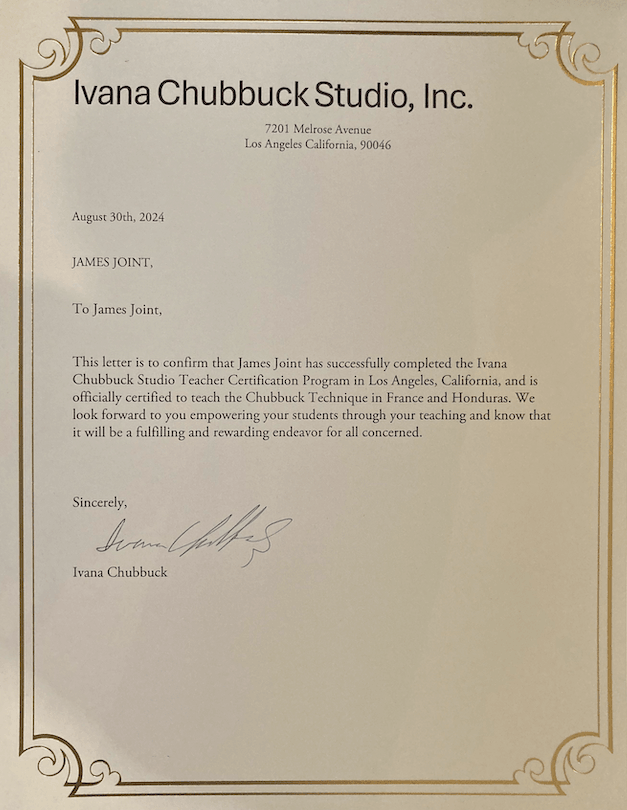 James Joint est certifié par le Ivana Chubbuck Studio Teacher Certification Program.